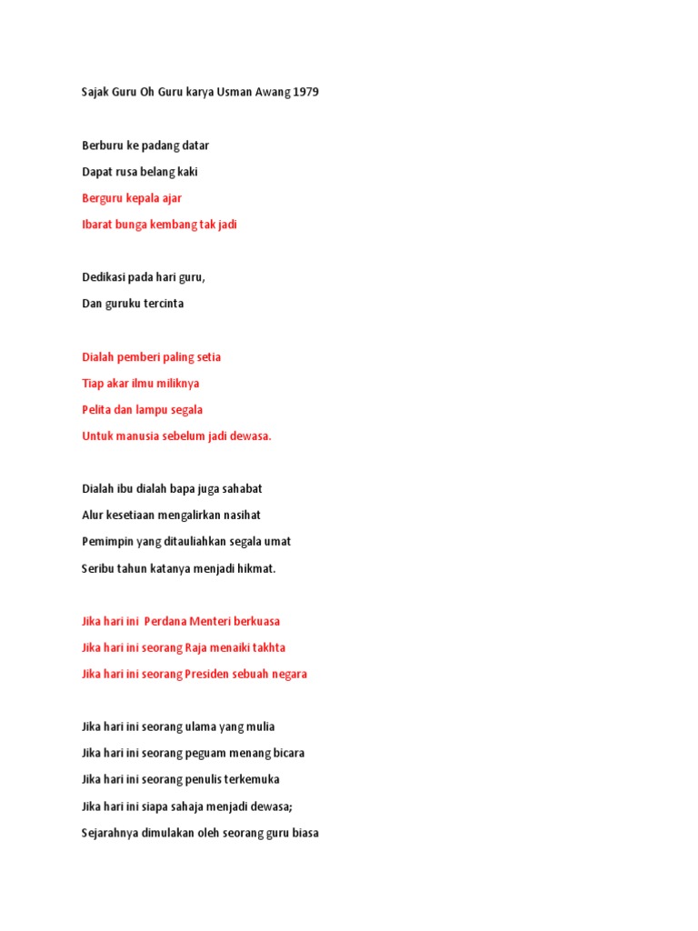 Dialah ibu dialah bapa juga sahabat alur kesetiaan mengalirkan nasihat pemimpin yang ditauliahkan segala umat seribu tahun katanya menjadi hikmat. Deklaması guru oh guru 3:24. Yab tun dr mahathir mohamad perdana menteri. Untuk manusia sebelum jadi dewasa. Usman awang died of a heart attack on 29 november 2001 in kuala lumpur.